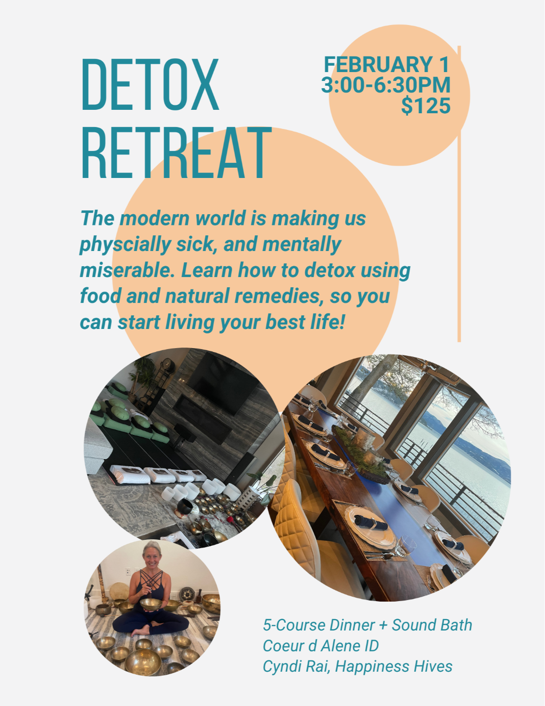 This is a very special monthly mini retreat at a gorgeous lake venue. You will enjoy a sit down detox dinner, healing Sound Bath and a detox workshop.